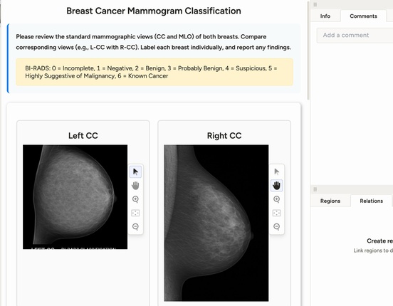 This labeling config provides a comprehensive interface for breast cancer mammogram analysis using the BI-RADS classification system. It enables radiologists to classify mammograms, assess breast density, and document findings for both breasts.